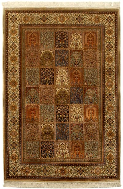 インド絨毯の有名産地 カシミール Kashmir カシミールは、インドの北部ヒマラヤ山脈西部およびカラコルム山脈南部を占める地方で上質のシルクの生産地です。このカシミールの絨毯は、ムガール王国になる前の15世紀にイスラム教徒がペルシアからの織り技術を伝えたといわれています。上質の絹をもちいて、織られたカシミール絨毯は、他の産地の絹の絨毯とはまた違った良さを持っています。また、スカーフの産地として栄えたカシミール独特の文様を絨毯のデザインにも取り入れた実にさまざまな色調の絨毯をつくっています。